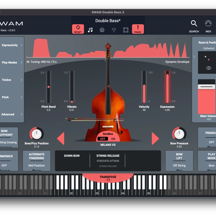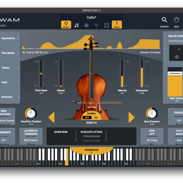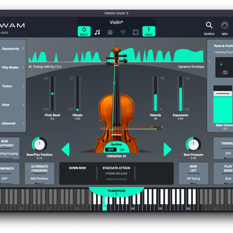 Experiment with parameters like bow pressure, bow position, vibrato depth, vibrato rate, and expression to achieve the exact sound you're looking for. The Ambiente room simulator further enhances realism by placing your instrument in an acoustically modeled space that responds naturally to your performance.